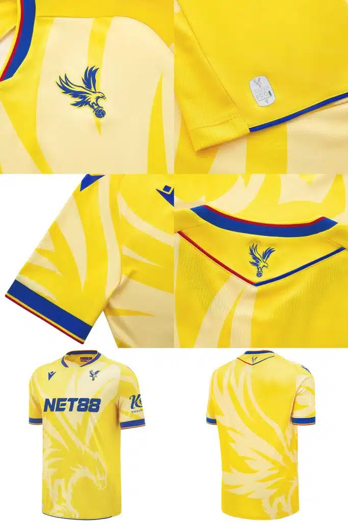 Manufactured by Macron, the Crystal Palace 2024/25 away kit is primarily yellow with blue and red applications on the collar and sleeve cuffs of the strip. The club’s famous eagle symbol has also been implemented into the front of the jersey.