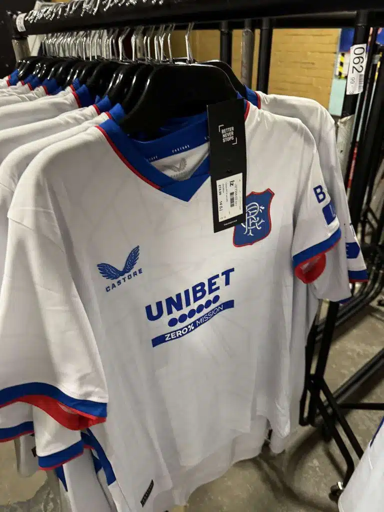 The Rangers 2024/25 away jersey, made by British brand Castore, is mainly white with blue and red accents on the collar and sleeves.