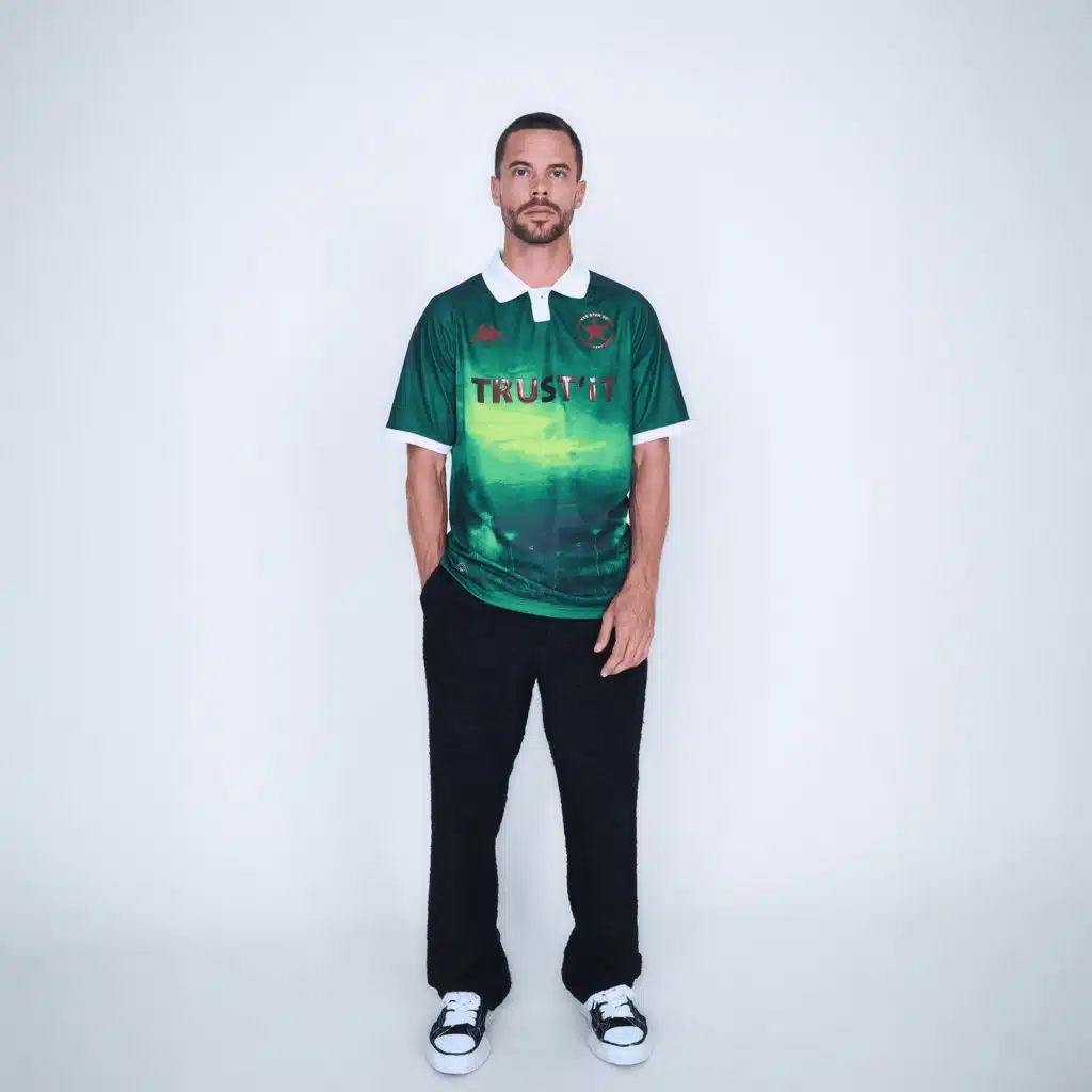 Manufactured by Kappa, the Red Star 2024/25 away kit is primarily green with a white collar and sleeve cuffs. The shirt was created by Octave Marsal and César Domboy from the DRACO creative studio. Inspired by 19th century engravings of the Château de Saint-Ouen.